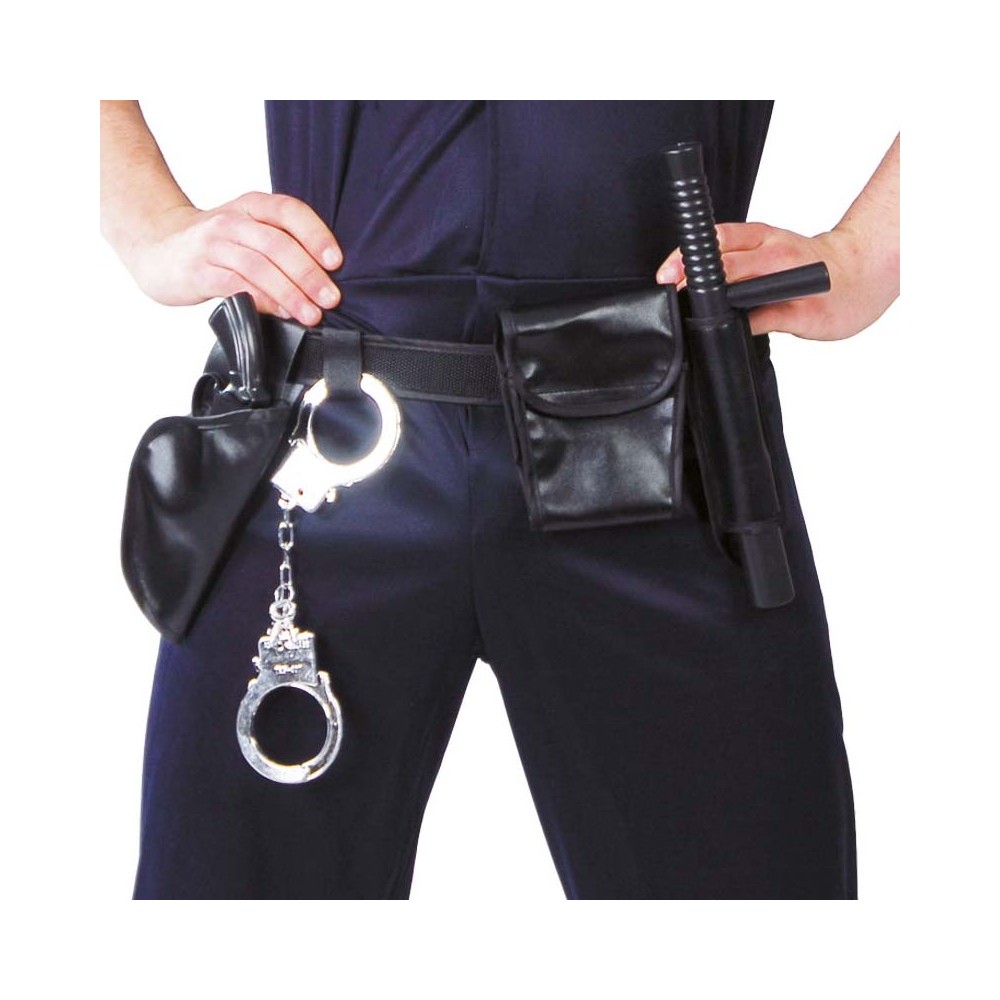 Contiene cinturon con cartuchera y pistola de plastico, esposas de plastico, bolsito con cierre de corchete y porra de plastico. Material: imitacion piel.